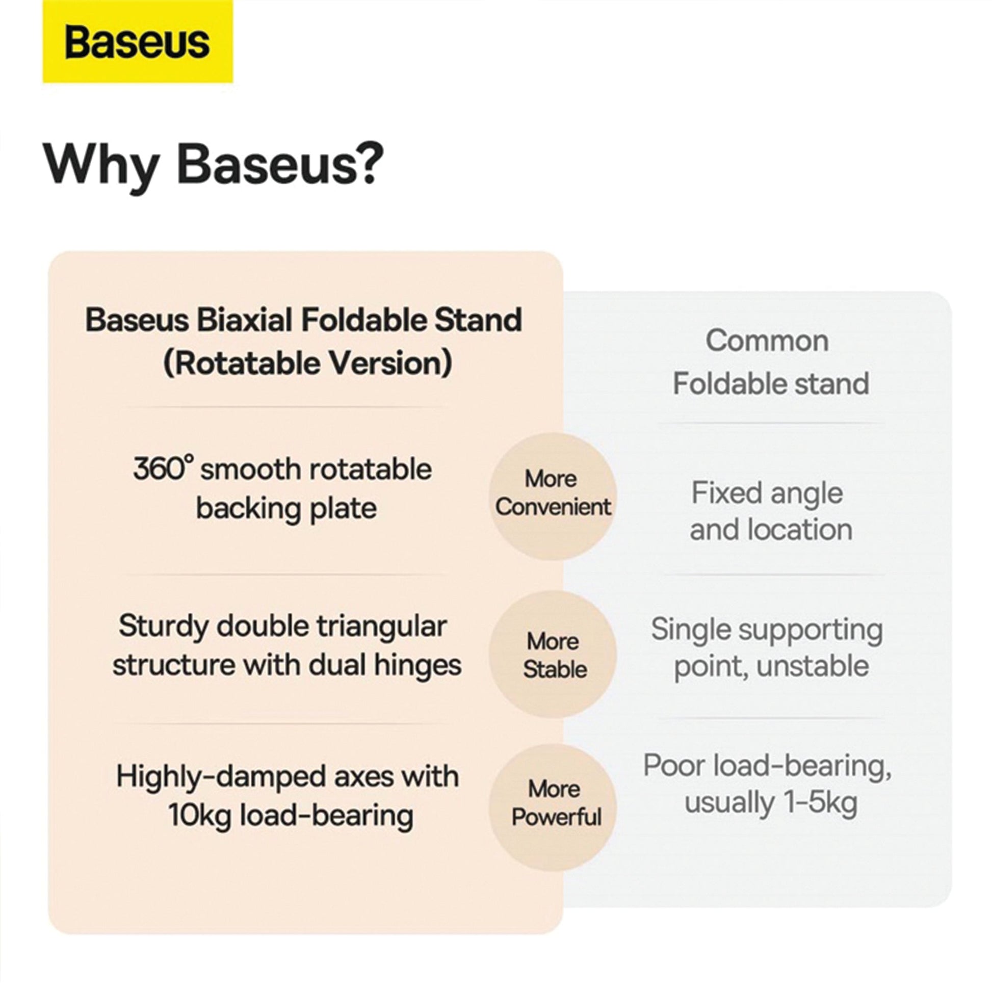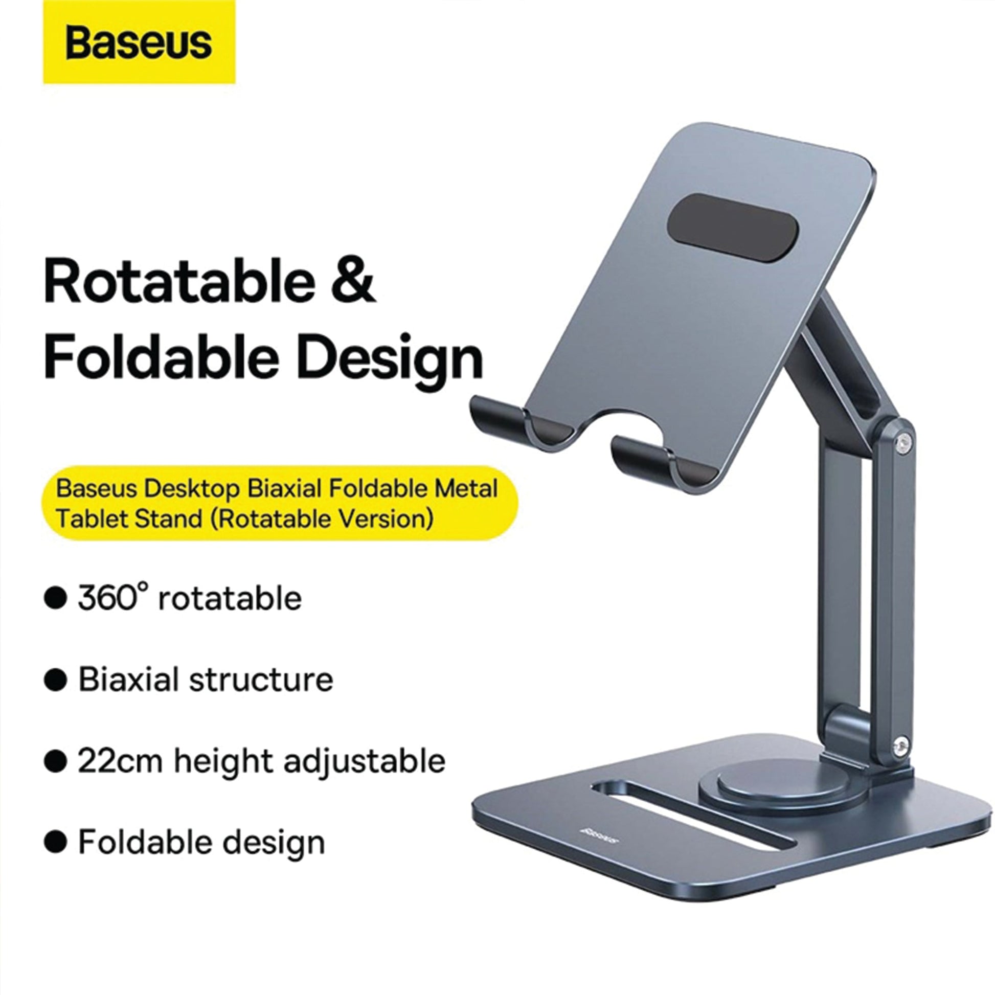 The Baseus Desktop Biaxial Foldable Metal Stand has a 22cm height adjustability. The base can rotate 360°, making it ideal for different viewing angles. It can support a load capacity of 10kg, while the solid supporting metal base prevents the tablet from tilting/tipping.