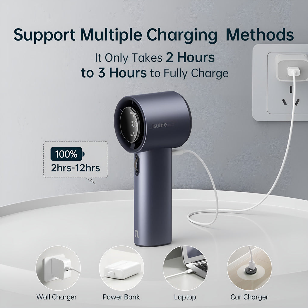 The Jisulife Handheld Fan Pro 1 is a compact yet powerful personal cooling solution designed for everyday portability. Powered by a 3600mAh lithium-ion battery, it delivers up to 12 hours of continuous use depending on the selected speed. Featuring a 100-level stepless airflow adjustment, the fan allows precise control of cooling intensity with a maximum wind speed of up to 9 m/s. Fast and convenient Type-C charging enables a full recharge in approximately 2 to 3 hours. An integrated LED display provides real-time visibility of battery status and airflow level, while the lightweight ABS construction, ergonomic handle, and built-in safety grille ensure comfortable and secure use during travel, commuting, or outdoor activities.