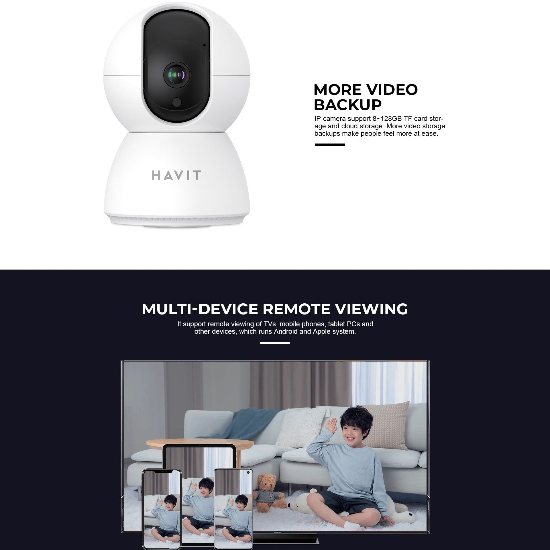 The HAVIT IPC20 Smart Pan/Tilt IP Camera delivers full-room monitoring with 1080P resolution and a 360° panoramic viewing angle for comprehensive coverage. Its intelligent AI human tracking and sound source tracking automatically detect and follow movement or audible activity within the camera’s range. Equipped with high-power infrared LEDs, it provides clear night vision to keep your home protected around the clock. The camera supports stable 2.4GHz Wi-Fi connectivity and enables multi-device remote viewing across smartphones, tablets, PCs, and TVs. With support for both local TF card storage and cloud storage, along with real-time two-way audio via the Tuya Smart app, the IPC20 offers flexible, reliable, and interactive home security monitoring.