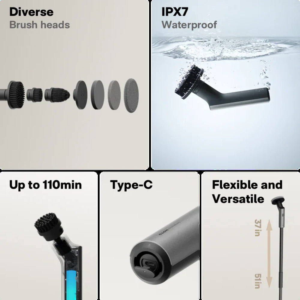 High-Speed Motor | Adjustable Speeds | 6 Interchangeable Brush Heads | 45° Ergonomic Grip | Detachable Extension Rod | IPX7 Waterproof | Lock & Brush System