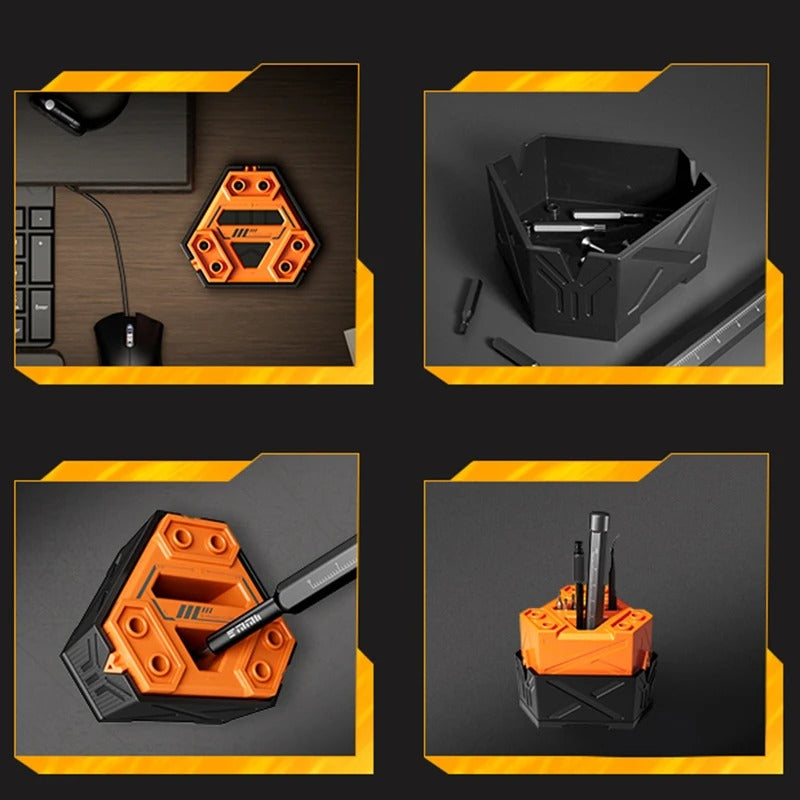 - 360° Rotation Cube Design: Compact, ergonomic design that serves as a stress-relief toy and screwdriver holder.